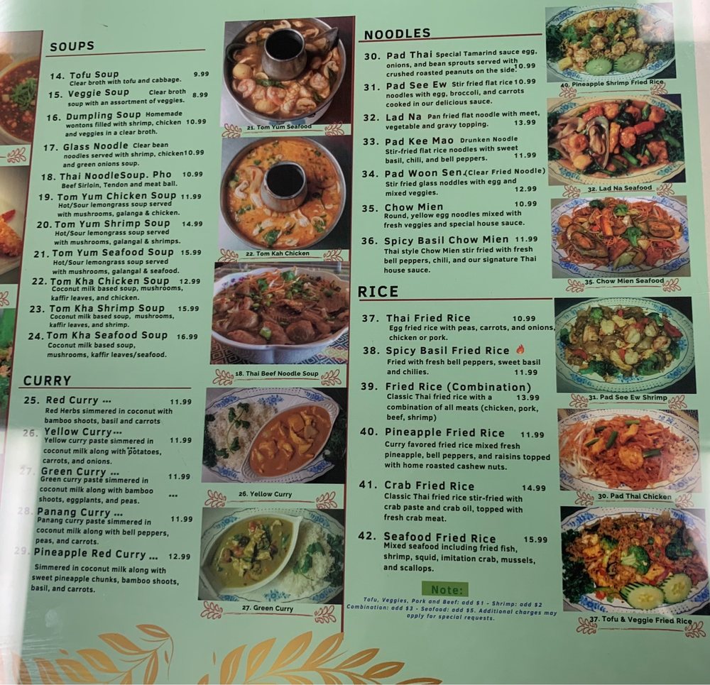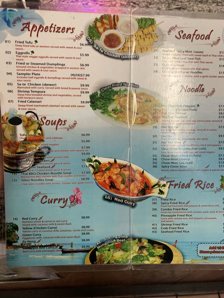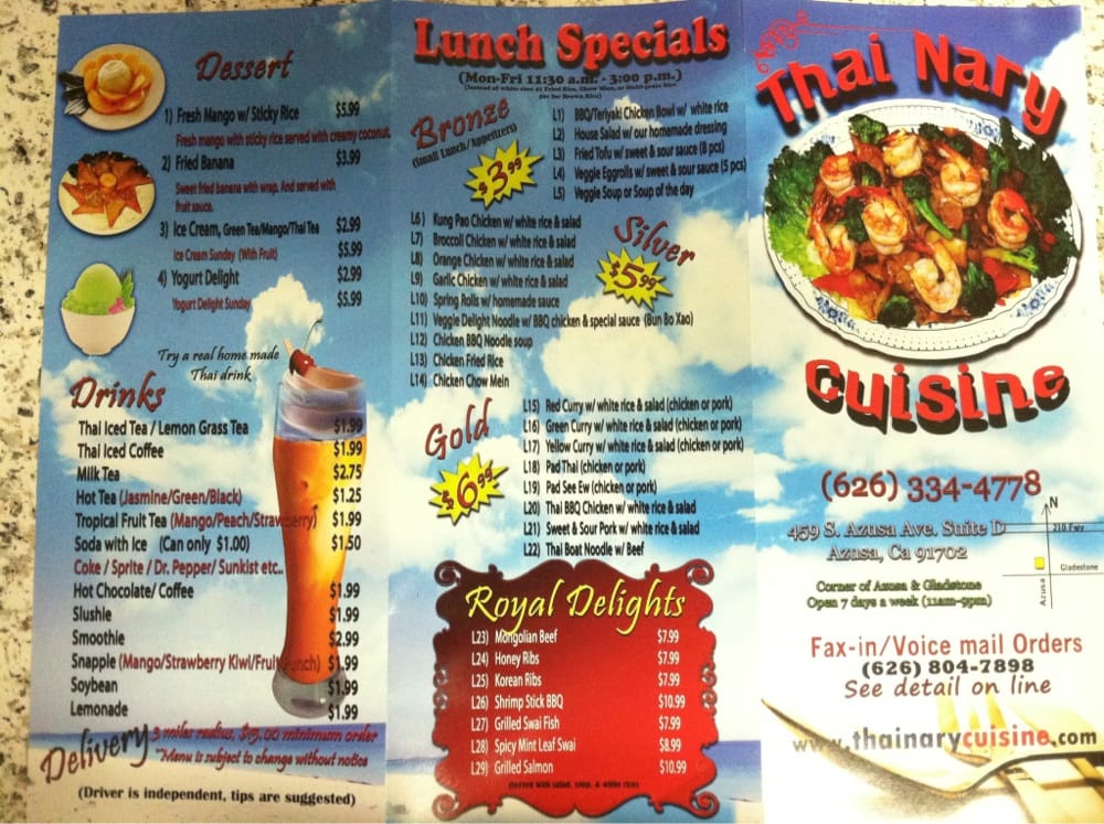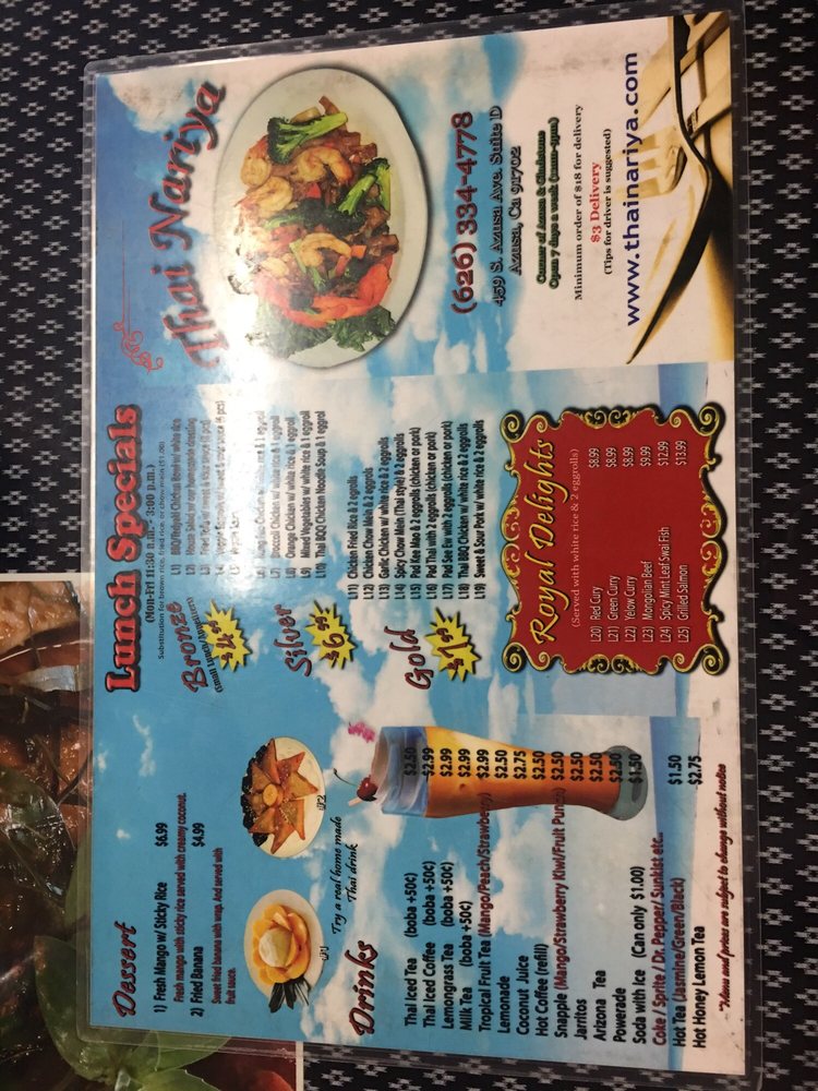 Introducing the menu at Thai Nary, a Thai restaurant offering a range of delicious options. From Orange Chicken Chow Mein to Chicken Larb Salad and Fried Tofu appetizers, there is something for everyone. The location in Azusa, CA provides convenience for those looking to dine in or order takeout. The reviews highlight the friendly service, with customers praising the owner Mary and enjoying dishes like Penang curry, Pad Thai, and mango sticky rice. With a welcoming atmosphere and tasty dishes, Thai Nary is a must-try for Thai food enthusiasts. Make sure to try the mango purple sticky rice, a customer favorite, and experience the authentic flavors of Thailand right in Azusa. Don't miss out on the happy hour specials and vegan options available at this gem of a restaurant.